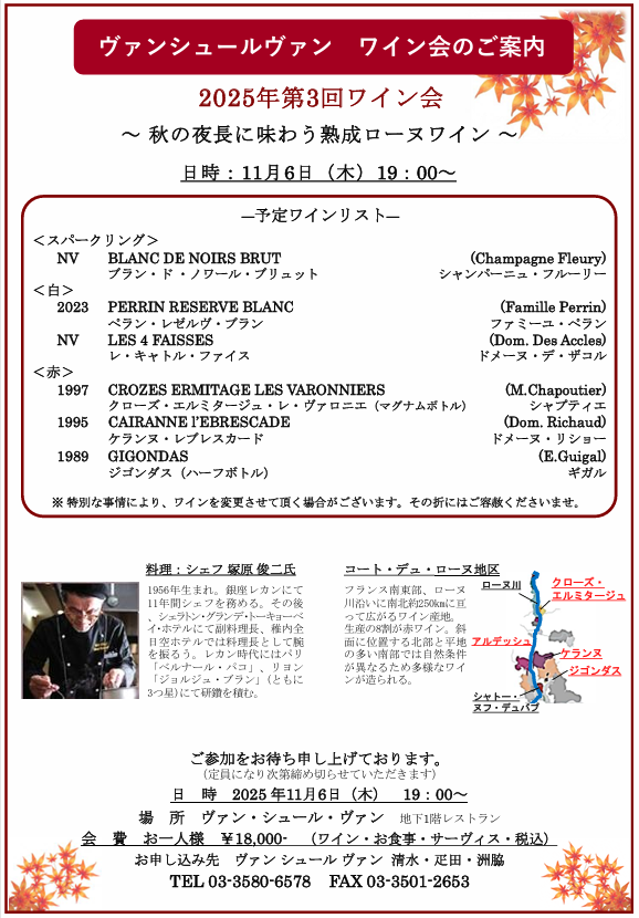 ご予約・お問い合わせはヴァン・シュール・ヴァン店頭またはお電話にて、