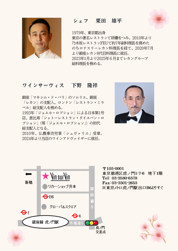 ヴァンシュールヴァンが誇るシャンパーニュ、ブルゴーニュの造り手たちに焦点を当て、その哲学と個性が表れたワインを、フランス料理の第一線で活躍されるシェフ・栗田雄平氏の料理とともにご堪能いただきます。